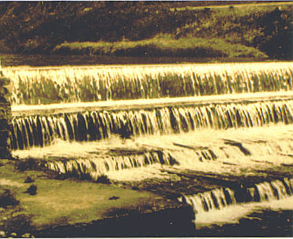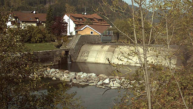 Sie wurde 1690 angelegt, um die Mühlen am "Neuen Teichgraben" mit aufgestautem Wiesewasser zu versorgen. Sie wurde durch Hochwasser allein bis 1729 nicht weniger als 5 mal zerstört. Nach der letzten Zerstörung 1944 wurde der mehrstufige Aufbau aufgegeben und die glatte Betonablauffläche geschaffen.
