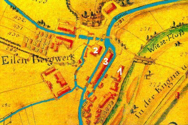 1: Lagerscheuer 2: Schmelz-/Hochofen 3: Hammerschmiede