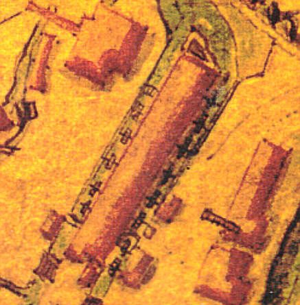 Dank der Detailtreue kann man auf dieser Karte von 1810 deutlich die 5 Wasserräder im linken sowie (etwas ungenauer) die 8 Wasserräder im rechten Kanal der Hammerschmiede erkennen.