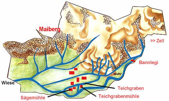 Unterhalb des Köhlberges wurde vom Wuhr ein Abzweig, der "Teichgraben" angelegt. Im weiteren Verlauf führte er parallel zur Wiese über die bebaubare ebene Fläche auf dem Hochgestade und wurde schließlich in die Wiese geleitet.