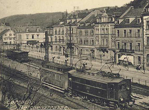 Dieser Ausschnitt aus einer Postkarte aus dem Jahre 1915 zeigt dieselbe Maschine mit dem badischen Nummernschild kurz vor dem Bahnhof in Höhe der Belchenstrasse in Lörrach mit einem Postwagen, vermutlich beim Rangieren um den Zug Richtung Basel anzukuppeln.