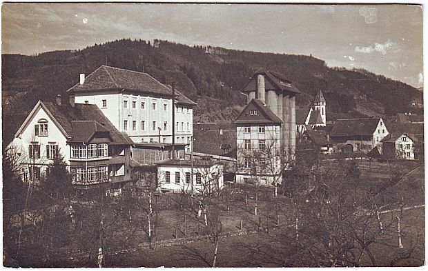 links die "Villa Menton", halblinks das neue Mühlengebäude, rechts daneben das Getreidesilo