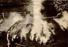Von oben senkt sich bei den Pyramidenmeilern der Verkohlungsprozess nach unten,