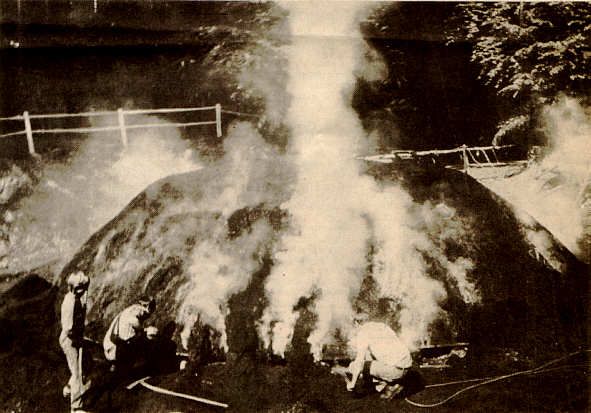 Ist der Aufbau luftdicht verschlossen, wird die Verkohlung mit dem Einfüllen von glühender Kohle in einen Füllschacht begonnen. Bald steigen aus den kleinen, vom Köhler in den Mantel gestochenen Luftlöchern weiße Rauchfahnen auf - das Betriebszeichen des Meilers.